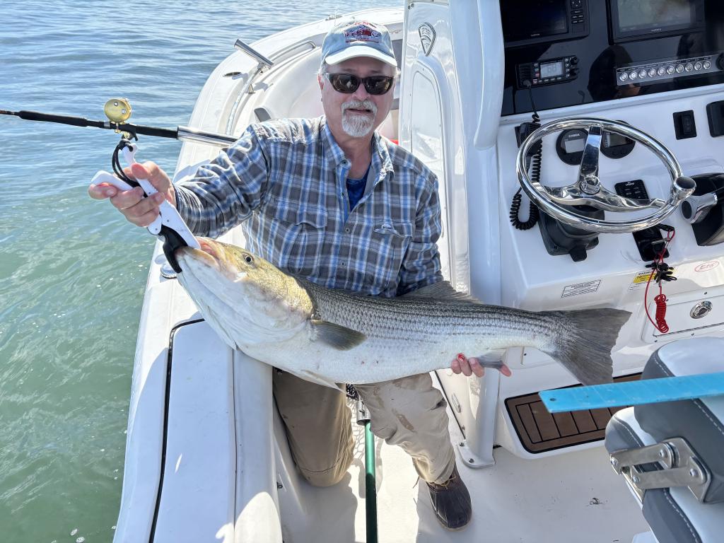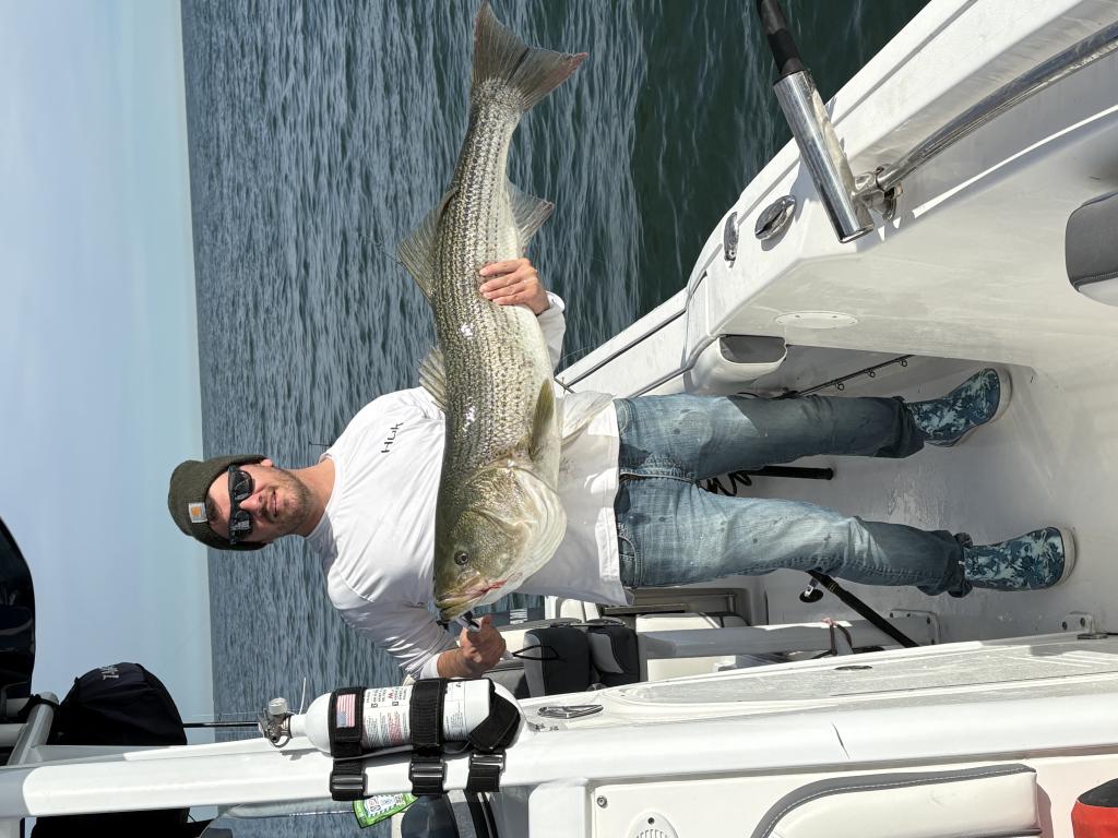 Wasted a few hours inshore on my Tidewater 232 Adventure in rocky areas with eels and slow drift conditions. Finally figured out they wanted floats set right at 20’ sitting over 21’ hump. Went 4/5. Got our smallest fish of 38” the rest 43-45” overs. Still slower than I wanted. Marking lots of bait but they were deep. Nothing in lures. Headed out just inside 3M line and saw fish blowing up in bunker. Stopped immediately and it was 2 hours non-stop on shads and live bunker. Hard to keep livewell stocked with snagging but we managed to keep up with supply and demand. All big fish - 44-48”. By 2:30 the bunker went deep (because bass stopped feeding, and headed back to port).