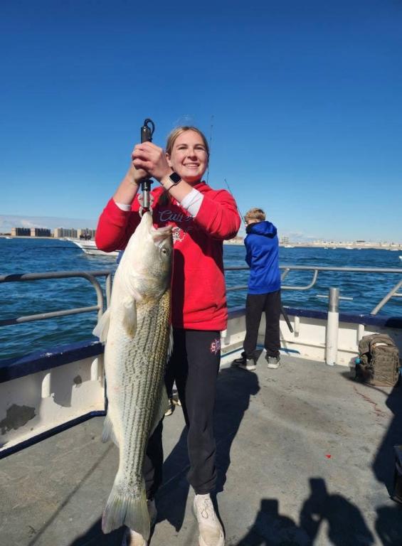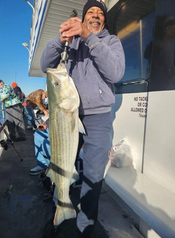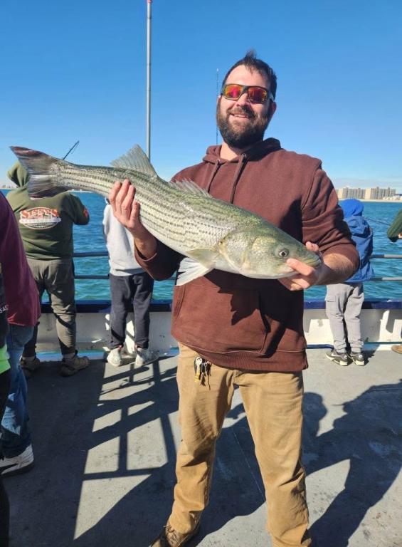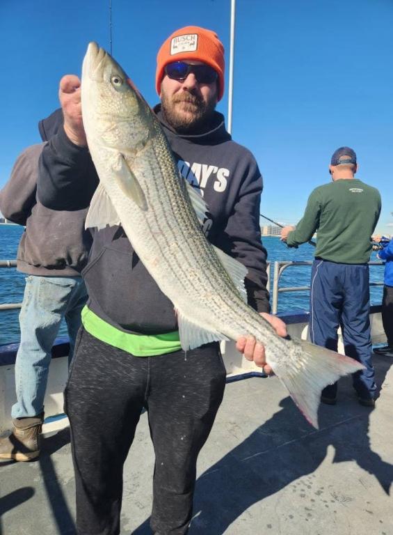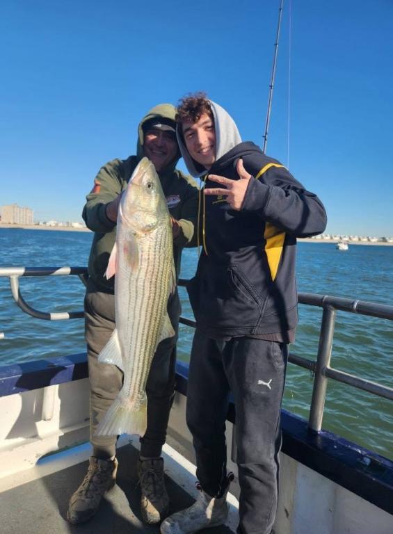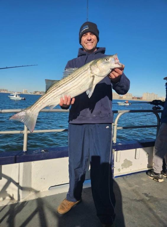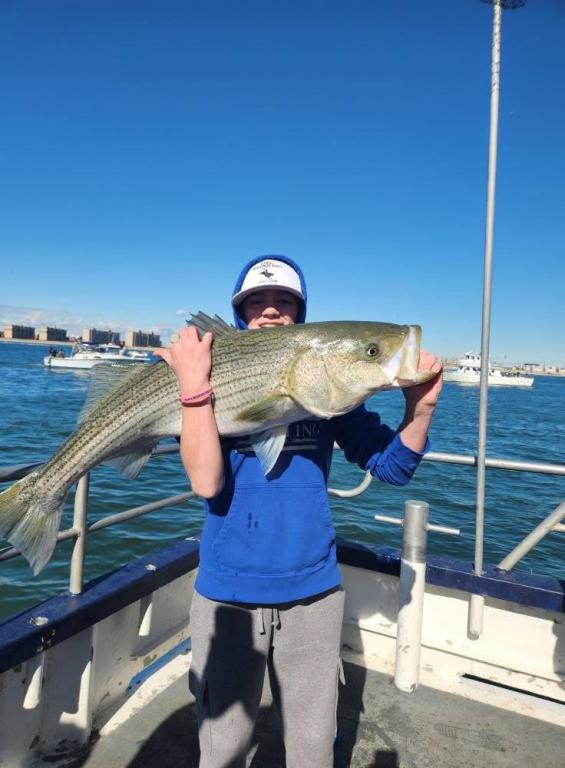 What a fun day on the bass grounds today, we took a little bit of a longer ride where we've been going the last few trips. We had John, Larry, and Danny on the boat today for quality service. Very exiting day, we were pretty much fishing with live bunker, plus jigs and shads. We landed 17 big fish and had 2 keepers. Ben was high hook with 3 overs, nice crowd in the mid 30's for a beautiful Striped Bass day. It's gonna be another beautiful day Sunday so let's go fishing! Your crew tomorrow will be Captain Jack, John and Danny working deck. I didn't get all of the pictures today but here’s a few). Sailing everyday 7:30AM-2:30PM and the fare is $90. We have brand new Penn Battle 3 spinning rods for rent $20!