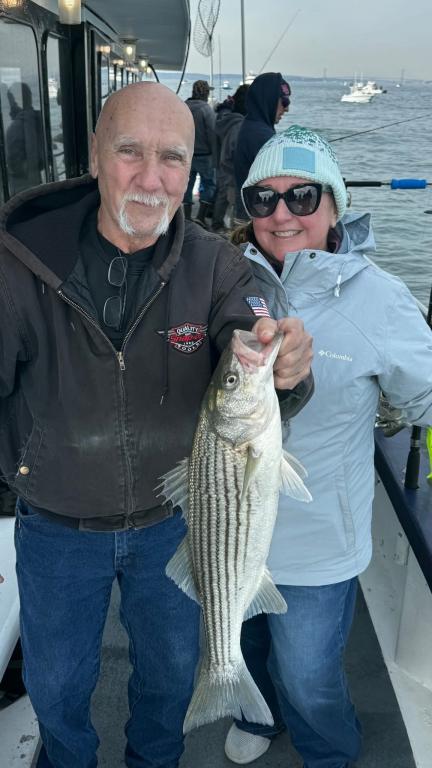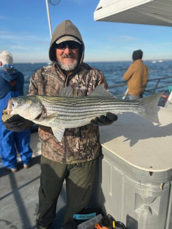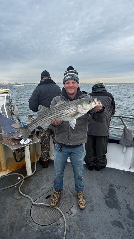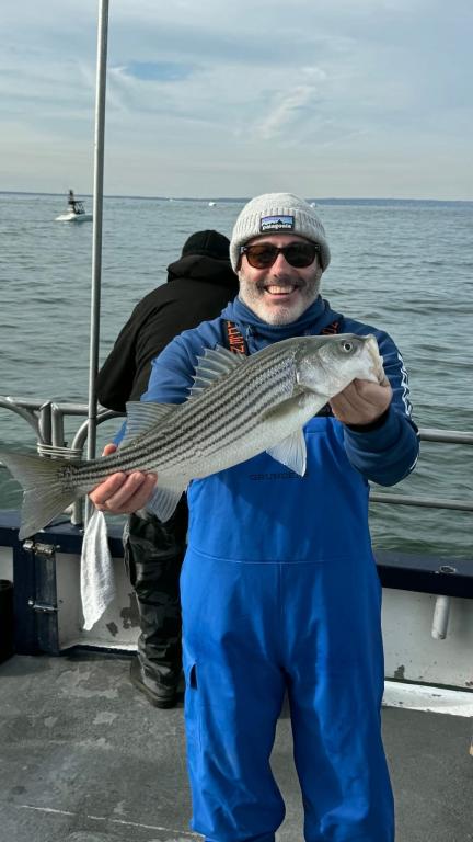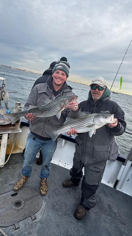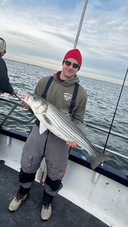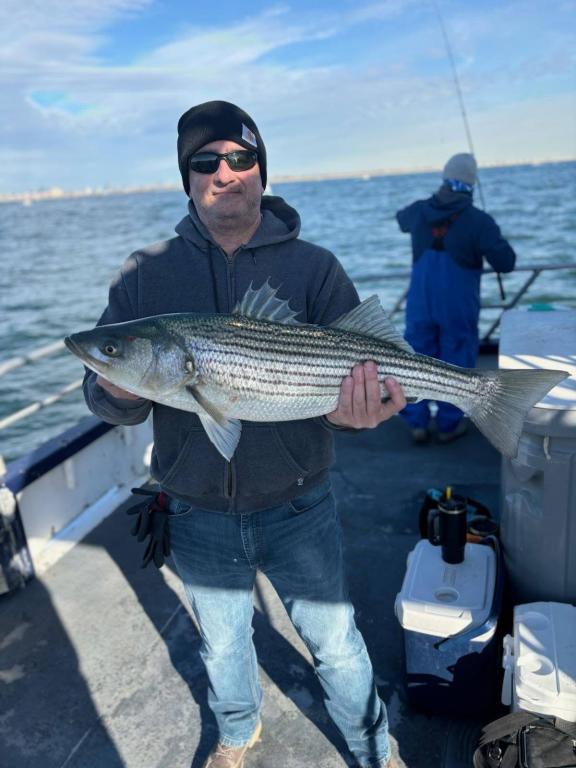 Hey gang! We sailed with a nice crowd of customers for a gorgeous Saturday in mid November. We put the peddle to the metal and flew out to the grounds first thing this morning. We knew the boat traffic was gonna be horrendous. Our best fishing was in the morning, we got a good shot of a striper blitz's and we slugged away the rest of the day. Ryan fishing the bow our Philly Eagles guy was high hook with 10 Striped Bass caught ORL. The highlight of the day was Ben winning the daily pool with a Monster Striper at 41-1/2 inches. I don't know how he dose it, but he wins a lot. Probably cuz he fishes everyday and is a pretty darn good fisherman. Here's a few pictures I took today. Captain Next trip is Nov 18th Tuesday. So get the warm layers on and Let’s go fishing!!! Sailing 7:30am to 2:30 pm. Thanks Captain Scott.