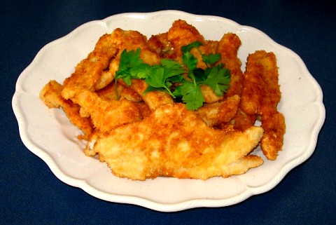 Ingredients 2 lbs ling (red hake) 1/2 cup instant flour 1cup Panko bread crumbs 2 eggs 1/2 cup Canola oil 2 gallon sized ziplock bags Directions Rinse and dry ling fillets on paper towels. Place flour in bag with ling fillets and shake coating the fish. Beat eggs with a tablespoon of water and coat fish with egg. Place Panko in other bag with fish and shake to coat the fish. Heat Canola oil in heavy non-stick skillet. Oil should be hot! Test with a little Panko crumb. If it sizzles, it's ready. Cook until golden brown, about 2 minutes on each side. Drain on paper towels. Serve with tartar sauce and lemon. Garnish with parsely. Enjoy! Leif