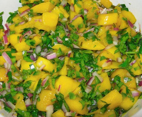 Yellowfin from our Sea Devil trip this past October. Ingredients 4-6 Yellowfin steaks Salsa 2 ripe mangos 1/4 in cubes 1 small red onion(diced) 1/3 cup chopped Cilantro Juice of 1 lime 1 minced Japelano pepper 1 Lime cut into wedges 2 tablespoons rice vinegar Mix above together and let stand 30 minutes. Red Onion Garnish 1 small red onion halved and sliced thin 2 tablespoons Rasberry red wine vinegar 1 teaspoon of sugar 1 teaspoon of sea salt Mix above ingredients and let stand 20 minutes, drain and garnish as shown. Marinade Ingredients White pepper Sea salt 3 tablespoons canola oil Juice of one lime Whisk the above together and pour over fish, let stand room temp. 30 minutes Coat hot grill with oil or non-stick spray and grill tuna 2 minutes on each side. Leif