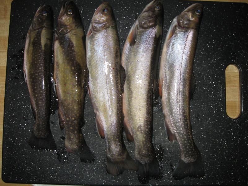 Met up with Doug Vitale at 5:30 for some after work trout fishing at The Hock. We started about 3/4 mile upstream from the falls and worked down. We picked at them for about two and a half hours, ended up getting three apiece, all brookies, mine on the white jig, Doug's on garden worms. It was a meat day for me so I kept them all, except for one that was lucky to be so scrawny. A pretty modest day all told, but we had fun.