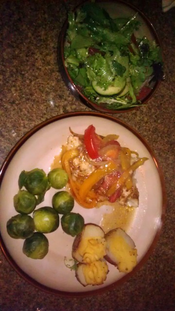 1/2 onion (yellow or vidalia) 1 med size ugly ripe tomato 1 large pepper (Red, Yellow or Orange) - Yellow or Orange/usually sweeter 1 lemon 1/4 cup chopped parsley 1/2 stick butter tsp onion powder tsp garlic salt tsp cracked pepper tsp creole cajun spice 1/2 tsp red pepper flakes (more like a few shakes for both the peppers/fish) 1/2 tsp paprika tbs Old Bay tbs olive oil 2 lbs of fish (4 nice size fillets) take a small frying pan and heat over med-high heat, add a healthy PAD of butter and chopped strips of peppers (halved if desired), and chopped onions. Season with salt and pepper, u can add a shake or two of garlic salt and red pepper flakes depending on how spicy u like it. Stir fry until onions begin to carmelize and peppers get soft. Should be anywhere between 5-7 minutes depending on volume. Once the veggies are tender remove from heat and set aside. take a glass pyrex dish (9x9) or whatever size u have, and add the oil to the bottom, depending on size you may need to a bit more olive oil to coat the bottom of the dish. Wash and pat dry the fillets and add to the dish. Add the seasonings mentioned above - No particular order, I generally go with the garlic, onion, pepper, pepper flakes, paprika, creole and old bay. Once all the seasonings are added, half the lemon and squeeze the juice all over the seasoned fillets. Add a generous pad of butter to each fillet then sprinkle with the chopped parsley. Make med sized wedges from the ugly ripe and after spooning on the peppers and onions add the tomatoes to the top. Pre-heat oven to 350, once oven is ready bake between 12-15 minutes depending on fillet thickness... juices in the bottom of dish should eventually start to swirl and sizzle. You should be able to just start to separate the thicker sections of the fish with a fork then you will know its done... err on the undercooked side if you can manage, fish is always best just barely cooked. Serve with rice pilaf or your fav veggie, spoon pan drippings over top for added flavor...