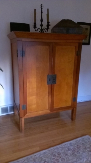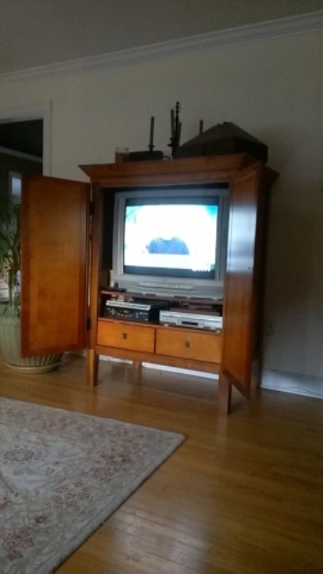 Pottery Barn Honey finish TV cabinet, hutch, armoire call it what you want all in one. Double fold away doors removeable/adjustable height shelf and two lower drawers for storage. Cut aways in the back for wire fitting for tv. Heavy duty well made and in very good shape, serious inquiries only -