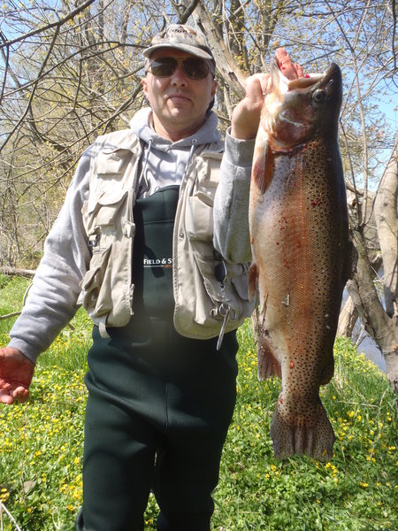 Had Anthony and his buddy Yuri out today...between the both of them 20 trout a mixture of brookies and rainbows. Anthony needed one more for a limit....we get to the last spot he takes a cast and nails this incredible 26 inch rainbow... 7 lbs. 6 oz. the largest trout of his life. Taken on a Black/Silver CD3 rapala on the Paulinskill River. Enjoy! Capt. Dave