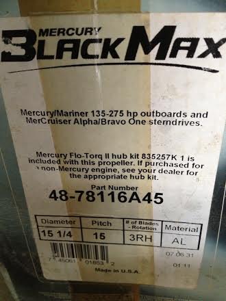 $40 - Brand new mercury cruiser black max prop - Pitch 15, Diameter 15 1/4, 3 blades, part number 48-78116A45. Box says good for all Mercury/Mariner 135-275 horsepower outboards and MerCruiser Alpha/Bravo One sterndrives (see pictures for more details), Paid $90 six months ago.