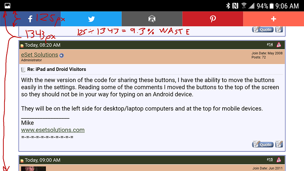 I went in and reduced the size of the buttons. If you are willing to do the math... then I am gonna sit up and listen! ;-) As for the hide feature... You cannot have an option to temporarily hide the buttons on the mobile version. Sorry! I don't want to get caught in a discussion about social media or the loathing of these buttons. I promise I will try and find the right solution between meeting the needs Gerry set for me and trying to appease the lion share of this community. I do appreciate your patience as I try things out. I'll try not to have these get in the way. Thanks again guys!! |
