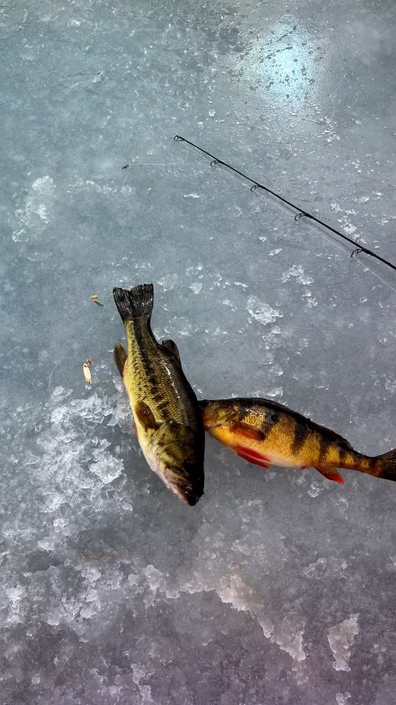 Drove by skunksville planning to jig for a few hours on the south end...need the boat for that...went up to wawayanda...jigged the front for a while 7/8 inches no readings...went to the back easy walking with take...4/5 inches..got this 13in lm threw him back and kept the perch... Tried the deep hole 85 ft..Lotta bait 20 ft off bot...hope the ice holds trying to get back there with some fat heads Mon...