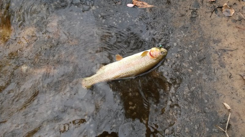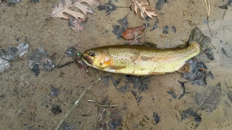 Started out in seaside throwing needles on light tackle to the many short bass that have taken up residence at the beach, picked up 5 bass no bigger then 21" and missed many many more. The beach lips are chocked with these little guys, after a n hour of this I headed to the Toms river TCA. This is hands down one of the hardest rivers I have ever fished, it is littered with snags, tons of deep holes,the banks are covered with Briar, the water is tea colored asnd its only about 20' wide at best. Anyway walked about a mile throwing jigs and picked up 3 rainbows that have picked up the tea colored hue of the river.