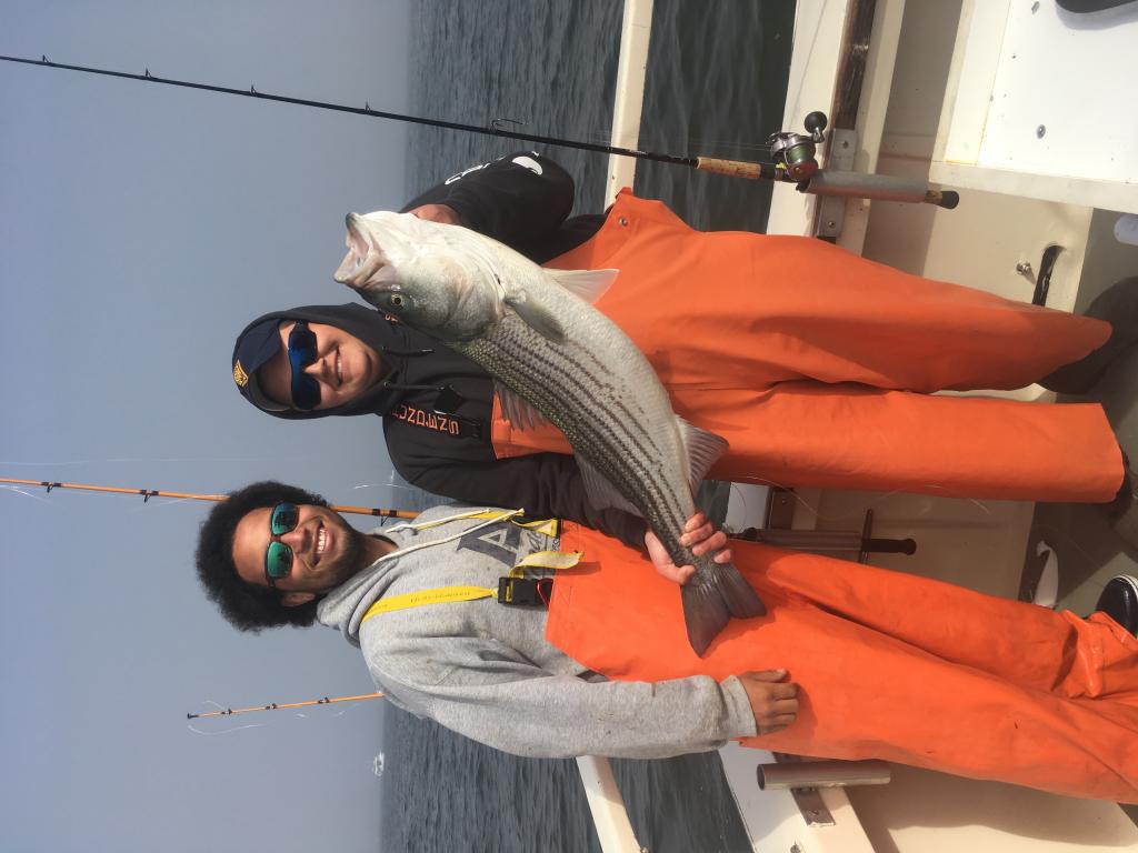 a doubleheader of 20 pound bass, and boating both of them with no help from anyone else . Consequently, AJ, now has the nickname ( double down ) AJ has been fishing with me now for three years, he is not a big kid , he stands on a box to fish , but he is big in stature, and fishes better than most adults which is amazing especially at this age. Besides fishing ability, he is a gentleman, and generally a pleasure to be around , which you cannot say about every nine-year-old, although most of the kids that fish with me are the same way. But their parents are too, basically I am fortunate I have a very , very nice clientele . We limited out , and we had quite a few nice fish. We will be back next Tuesday in shark River for the opening of Seabass , which we are running an Open Boat for , and have plenty of room. We are also open boat iSunday Mother’s Day,, and Monday Both those trips will be for striped bass call for information reservations, pictures will be posted later and on Facebook |