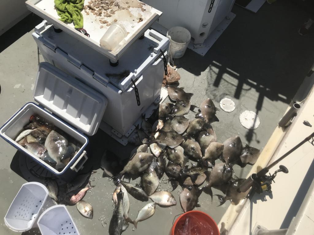We had an amazing day with triggerfish today Seabass, and porgies . But the big attraction was the trigger fish, great big trigger fish, some four he half pounds. We will be fishing for them again tomorrow Tuesday the 10th weather permitting and hopefully for a while. call for information reservations photos will be posted later