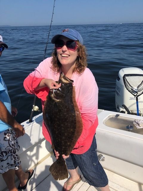Ran our open boat fluke trip. Bounced around all day catching a few keepers and shorts at each spot. Highlight of the trip was Diane catching her pb at 8 pounds. Ended the day with a total of 16 keepers to 8# and some sea bass.