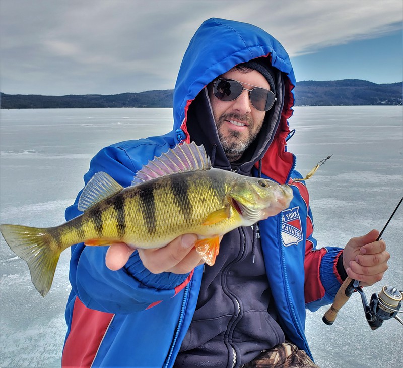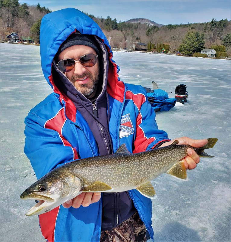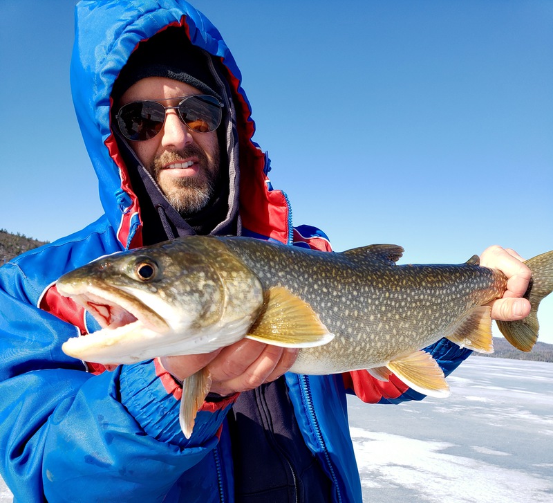 Since leaving Lake George for the first time earlier this month, I knew I had to get back up there one more time before ice out. The rest of the original crew felt the same way. We all met up Friday night at the same place and hit it hard at first light on Saturday and Sunday. The action was slower than last trip but the fish we did catch were quality. Our buddy got into his first iced lakers this weekend and I believe ended up being high hook. Chrisper got into some cool catches that I hope he will share in this post. Here's a few pics from my shelter. The one laker was a little acrobatic for the picture and bananas have similar effects on ice as they do on boats:D:D:D