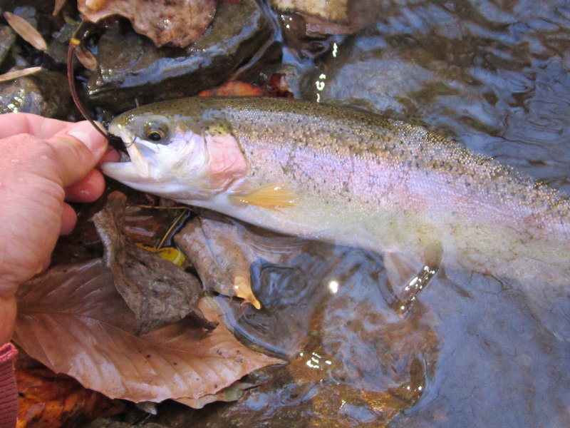 Decide to hit the south branch today and see whats happening,lots of leaves and a few nice fish.Fish were deep and spread out but very aggressive ,tried lighter colors first but no love love switched to black and thats what they wanted picked up 4 bows to 22" and a holdover brown.The big bow was camera shy I was trying to get a good pic and away he went.Attachment 41934Attachment 41935Attachment 41936Attachment 41937