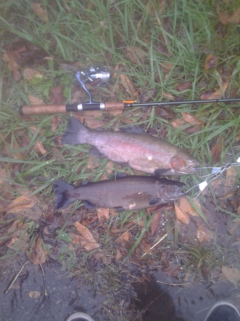 Hit the usual spots for trout/smallmouth, it was fairly warm at first and the rain wasnt too bad, plus there were hardly any leaves floating for some reason. I wasn't specifically targeting fall stockies at first but had better luck than expected...threw out a yo-zuri pins minnow with no luck, switched to an orange trout mag under a float; got 2 dink smallies back to back. Headed a little downstream to a deep channel with nothing for a while, then saw something big dart across the riverbed. A little while later, the float shot down and i hooked and landed a fat 14" bow, first trout of the fall :) fought like a stick though... Drove upstream and fished the same setup through more deep passes. Got a 15.5" even fatter bow; much stronger fighting fish. Guy fishing next to me wasnt catching all day so he came over and asked how i did it, so i gave him the whole lecture on the wonders of trout magnets :D. Fished and talked with him for a while and got a 12" smallie. Gave him the same TM as mine, i walked upstream and he got a decent trout, looked at least a foot from the distance. Headed out after the rain came pouring down, but definitely having much better luck than last year's fall stocking.
