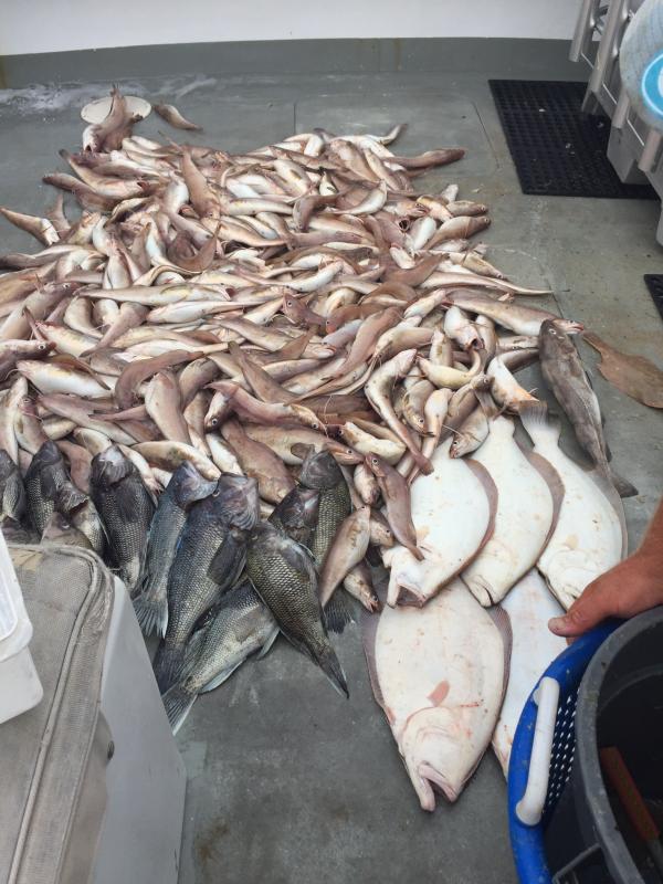 Well we beat them up pretty darn good :D not quite as good as JMurr and crew but we gave it our best. 300 ish ling, dozen nice sea bass, 5 good quality fluke and 1 lonely Cod. Great fun fishing with some nice people great Capt And mate. Always aces. Should you find you may be offended by a pic of a lot of dead fish please scroll on past. Attachment 86709