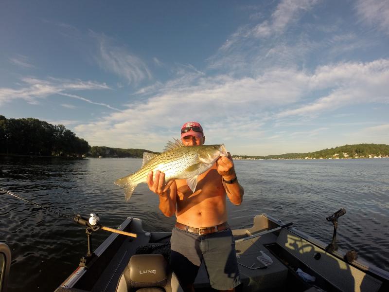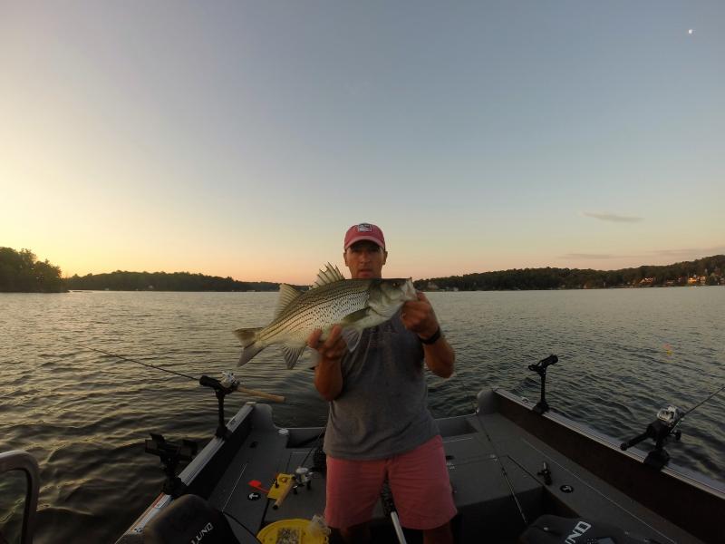 I haven't had a chance to fish in over a month due to my kids softball and soccer tournaments. Finally had a small window Saturday morning , so I headed to the big lake. Got some herring from Dow's and set out my spread. I saw a lot of marks 15 feet down in 30-40 feet of water. Made the adjustment and picked away at stripers, walleye, smallmouths and perch for three hours until I had to leave for a softball game.