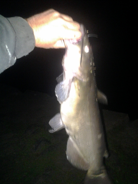 Its been so long since i last tried for cats on the big river. started fishing around 7:30 with a tub of livers and around 8 live sunnies. while waiting for mr. whiskers to bite i threw out a grub here and there and managed 2 baby largemouth. shorty after a striper takes the liver rod, small but a good sign nothing much after that besides eel bites. made the smart move to switch over to cut bait and soon after got this nice 5lb kitty around 9:00, couldn't get a nice pic though . nothing touched the live gill. action was dead after that and around 11 i called it a night.