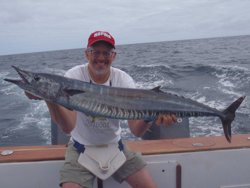 6 Wahoos from 30-60 lbs. My wife Sharon caught the biggest which incidentally was bigger than her! Also 3 small yellowfins. Ate some that night at a restaurant on shore....unbelievable! For anyone who has a deep appreciation for the diversity of life, the Galapagos Islands is a MUST on your bucket list. Snorkeled with Galapagos Sea Lions, Whitetip Sharks, all sorts of reef fish. Observed blue footed boobies, red footed boobies, waved albatross, marine and land iguanas, the famous tortoises, and of course dinner and lunch with Darwin's finches that sat on our table and chairs with no fear of us. A remarkable trip I will take with me for the rest of my time here. Fish caught at Punta Pitt offshore of the island of San Cristobal....Enjoy! Capt. Dave
