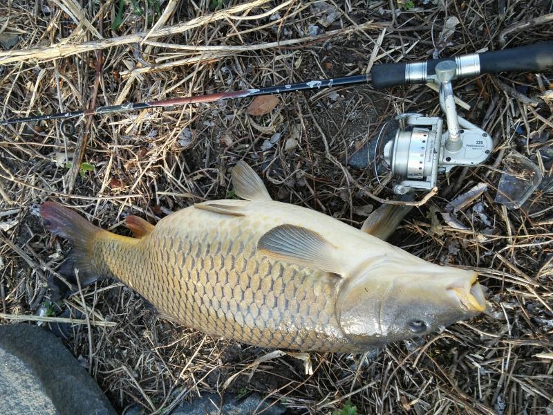 Gravid female common on a 1/32 oz black leadhead jig with yellow eyes and 1" twister tail. Took a half hour to land it in the Millstone River. Lots of carp were jumping but I didn't get a hit on corn meal bait. I was very fortunate that the 2 resident psychopaths didn't come over to my spot and cast across my line like they did the previous day.