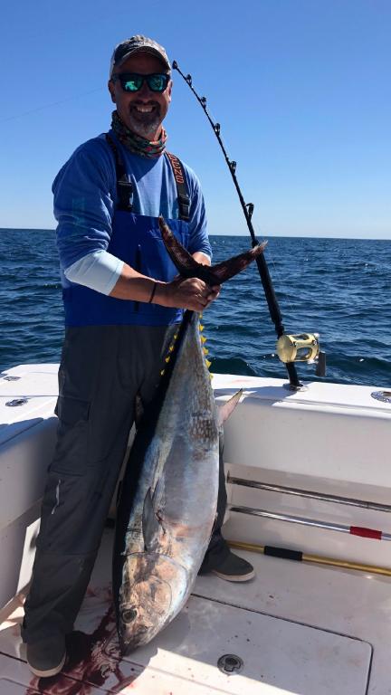 Tony and I looking to get out and back before weather turns later this week. Got to a good area with life but got slammed with little tunny. Made a move found more life this time with the right one 50" at 79lbs. Flew back to barn in time to make office hours.
