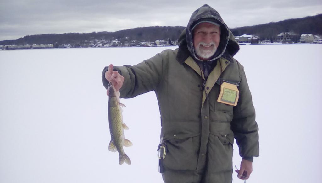 I went out on the big pond today to see if any fish wanted to play and was not disappointed.The ice was 4" of solid black ice with 1" of snow on top the wind has been blowing at night so the lake is only safe in some spots and most of the main body of the lake is open water. I found fish in 6' range close to the bottom they wanted the meat on a jig the fish did not want to play with the plastics or bare metal jigs. The weeds are close to the bottom for the most part and there is small patches of standing weeds here and there so when you cut a hole you do not end up with salad in the hole so that makes for better fishing opportunities. I ended up with 5 perch from 6" to 9" and one 11" crappie for the table. the photos were from today had trouble uploading them tom did a great job keeping the slime darts away from my offerings..