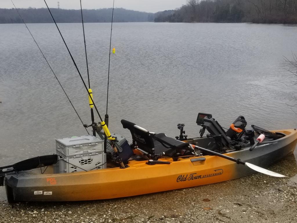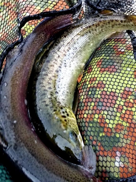 Went out yesterday in Raw conditions to a very popular north jersey lake stocked with Salmonids. Trolled in 12 n 20 FOW. Had an amazing Double hook up. (Flicker shads acting as divers with rear hook removed instead put a BB swivel... 3 ft of flouro to a small spoon). The trout hit in 12FOW and as i stopped to reel in... the other rod went in 20FOW with the Landlocked running under the yak. Netted the trout then reeled the Salmon and scooped it up concurrently. Almost had a 3rd surface bitter as I dropped my lure in the water while unhooking n the wind drifted me. Whatever it was... it got off.