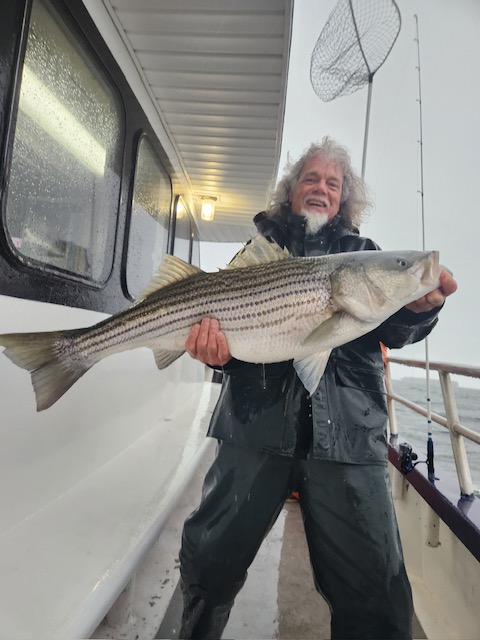 Hey gang, we had 10 brave customers show up today to go striper fishing even knowing the conditions. Kudos to them. We left the dock at 7:25a.m. and we used our speed to fly out to the grounds because we knew we had to get the job done early today with the strong outgoing tide against the east wind. We are 2 fish away from a boat limit this morning at 9:30, which is a good thing because it's starting to get evil out here. We had big overs with the slots and the bonus fish and even small fish. Jimmy, the farmer, had his personal best with a solid 40 lb. trophy fish. Russell and Mark and the rest of the guys are having a blast today. Joey, Sr. was screaming for me to come down, we have 6 on! Green tail jigs were the ticket again today. We have rain, wind and a little fog. A little bit of everything, but that's what the stripers love. The next 4 to 5 days look great for fishing with good conditions. Don't miss the bite. Come down and join us. 7:30 a.m. to 2:30 p.m. fare is $90; spinning rods are $10 if needed. The plan is to fish until the end of Dec. and hopefully that will happen. It's been a great Fall season so far. Thanks, Capt. Scott Wow what an awesome day got them the bite in the calm water at the end of the day on change tide bite. Ponytail Mark just beat out Russell for the pool today.