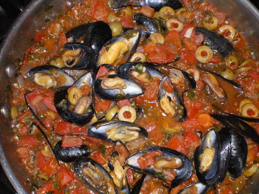 2 lbs. mussels steamed in salted water ( red wine Optional ) 8 to 10 Ripe Plum Tomatoes ( diced ) 1 medium onion ( coarse chop ) 4 garlic cloves ( fine dice ) nice bunch fresh Basil chopped 4 to 6 Tbsp. Capers Calamata Olives sliced to taste ( optional ) pinch of Oregano ( Dried ) 1/4 cup Olive Oil In a large pot steam Mussels till just open, drain and let cool. Remove top shell, in a large hot pan, add Olive Oil sautee onion lightly translucent, add Garlic when you can smell it, add Tomatoes. Bring to a boil reduce heat simar 1/2 hr. add Basil, Capers, Olives, and Oregano. Stir the Mussels back in simar 5 more min. Enjoy