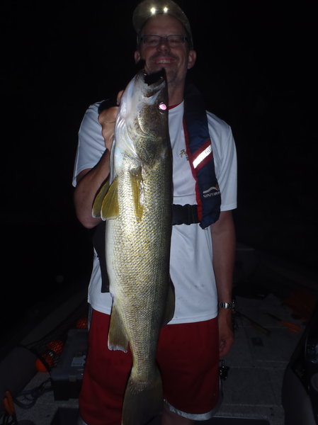 Wouldh've been over 20+ counting blow-ups and misses...despite incredible algae bloom and 80 degree water temps...fish bit all night....F18 Chartreuse/silver belly rapala. Largest fish went 7+ lbs. and was released..