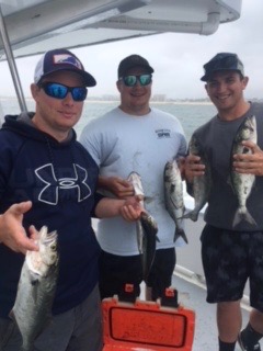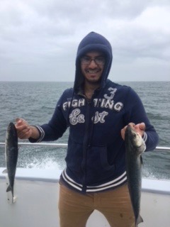 We had action pretty much all day with the BLUES. They were a little bigger than yesterday. The fish were on top splashing around and the birds were all over them. You had to work a little harder to catch them but everybody was happy and had fish to take home. We also had a short Striper and a few SEA BASS. They were all on jigs and teasers.
