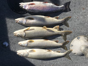 Took a break this weekend from the hard water..... I traded in the tipups for some planner boards and woke the black mamba up from hibernation and hit the valley. Set up the spread and the 8 planner boards and worked the big pond til about 230. I ended up with one nice holdover 20-21” ish and four lakers. Lost a few more througout the day.......