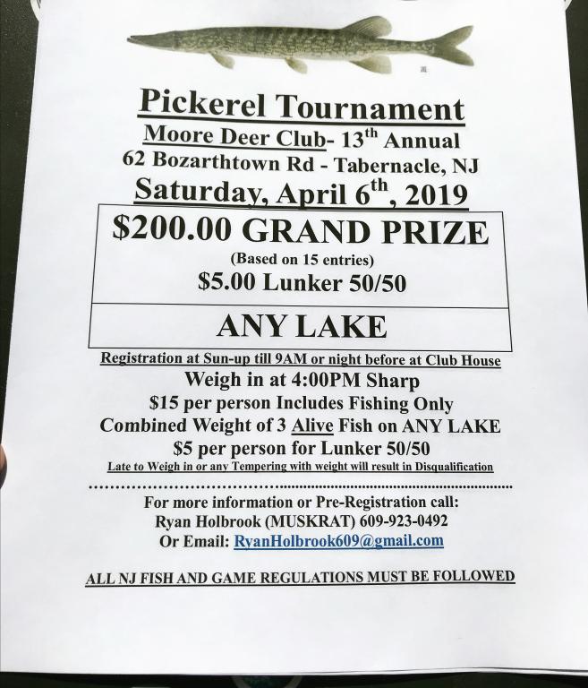 Hey guys. I’m a member of a hunting club down in Tabernacle NJ. Every year we run our annual Pickerel Tournament. This year I picked the date of April 6th so just over a month away. Figured I would share this with some fisherman who might be interested. It’s a FISH ANY LAKE tournament. The winner is determined off of combined weight of 3 Alive fish. Weigh in is at 4pm at clubhouse the day of the event. $15.00 to enter and if you want to get into Lunker 50/50