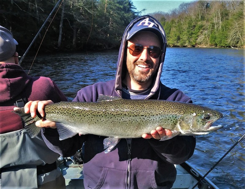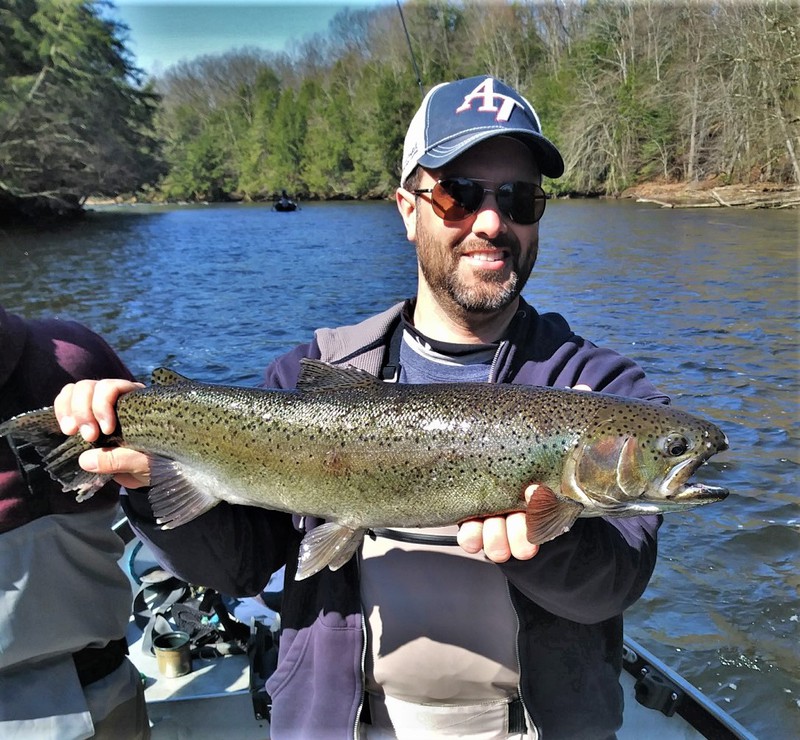 recent stocked wild or long term holdover After work on a later date, with the rivers calmed down a bit, I hit up a NJ spot after work and found the fish to be super picky. After going through a bunch of lures and flies, I found what they were looking for...the evil plug! Ended up nabbing quite a few wild browns and a wild rainbow, including this absolutely gorgeous brown that was either wild or long term holdover (i'm leaning towards wild, based on body shape, color and strength of fight). OMC and I also did a last minute trip the other week to hit up some fallback steelhead in NY. We opted to pay for a drift boat for the day and we had a real fun, relaxing, ball busting day we went 14 for 24 I was using a center pin for the first time so I may have skewed the fish landing ratio haha.