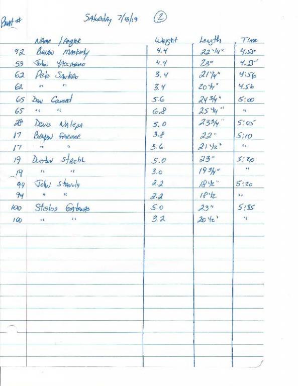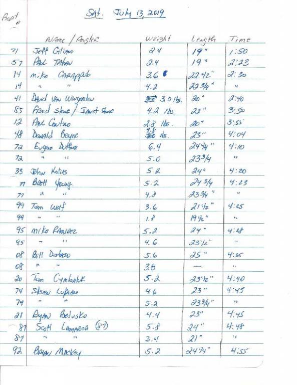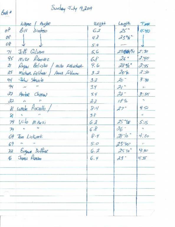 Its everyone who took part that makes it possible every year...for the past 38 years of doing this tourney. Our sponsors gave quite a bit of gifts away on Friday at the captains meeting..I know it took a while to get thru them, it was me calling out the Boat #s and names there! So make sure you give them the support they deserve as well. Once again, thank you and if you are interested in joining up...our meetings are every 2nd friday of the month at the Senior Citizens building. It doesn't take much to join...but you get quite a bit in return if you put a little effort in. The 38th annual Sandy Hook Bay Anglers tournament was held July 13 & 14 : We had over 100 entry's and 60+ fish weigh ins. 1st $3,000. Ryan Belusko from Coplay, PA and the angler was Mike Kalincheck 9.6 lbs. 28 1/2" 2nd $1,000. Wade Piscadlo from Manville, NJ 8.4 lbs. 27" 3rd $600. Tom Licknack from Hightstown, NJ 8.4 lbs. 28" 4th $350. Don Coward from So. Amboy, NJ 6.8 lbs. 251/4" Don also won $200. for Saturdays largest fish 5th $250. Mike Ramirez from Matawan, NJ 6.8 lbs. 26" 6th $125. Vito Manzi from Morganville, NJ 6.8 lbs. 26" 7th $100. Eugene Duffner from Freehold, NJ 6.4 lbs. 241/4" 8th $75. James Romano from Port Monmouth< NJ 6.4 lbs. 23" The ladies prize of a rod and reel winner was Janet Stone from Succasunna, NJ with a 4.2 lb. fish Thank you to all our sponsors for there continued support. Brian Dunn Tourney Director Sandy Hook Bay Anglers
