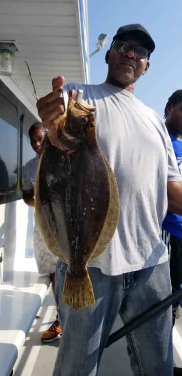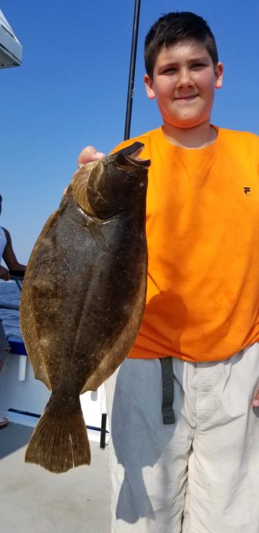 Hey gang, we got in to double digits on keeper fluke today with alot of 16 inch to 17inch in the mix. Also caught and released a large smooth back puffer fish that came up from the Gulf Coast. Had some regulars and a nice group of school kids with their Coach and chaperones on board today. Sailing 730am to 230pm everyday. See you all tomorrow.