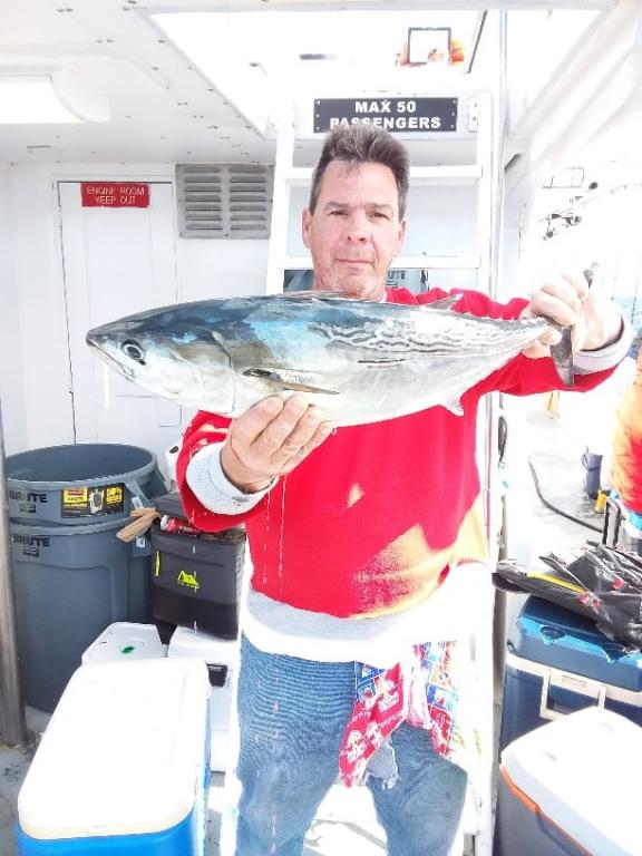 Though we saw a ton of fish out there today, we had to work for every single one of them. The majority of the BLUES were small to medium size but there were some large ones in there also with the pool winner around 10 to 12 lbs. We had DECENT ALBACORE action and they were 5, 6 or 7 lbs. each.