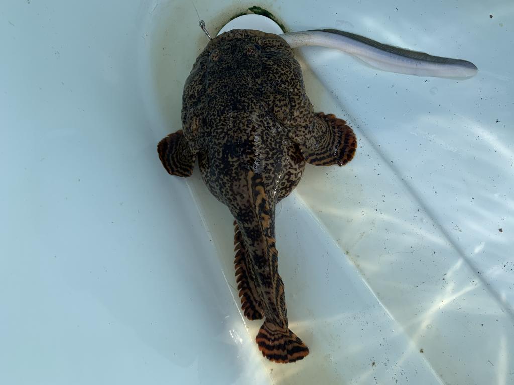 Tough to tell exactly from that angle because the body shapes are similar but its either an Oyster Toadfish or Stargazer.. Either one will hit a jig, but toads are more commonly caught in tidal salt water rivers and bays, while most Stargazers I have seen were caught right close to the ocean shoreline from the beach or jetties,, Never saw a Stargazer in the rivers or bay personally.. Millions of toads in the bays/rivers/canals/tidal creeks etc. Both are friggin ugly as sin with the Stargazer being even more hideous than the toads.... bob