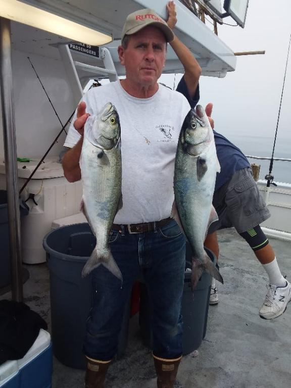 We saw fish when we anchored but it was a pick all day. We had BLUEFISH in the 4 to 10 lb. range and also some PORGIES and SEA BASS. At the end of the day, we had some DOGFISH.