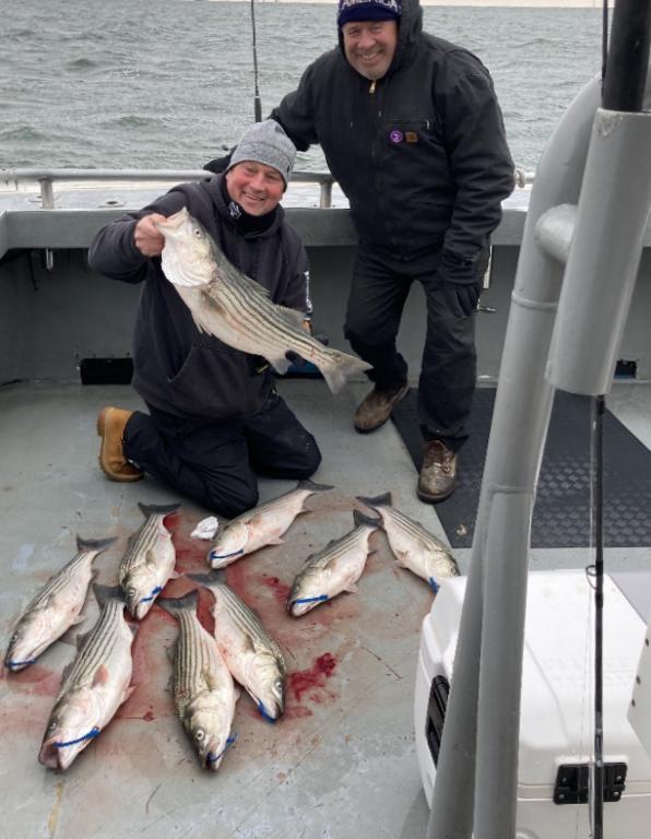 Tuesday aboard the Down Deep Bull we ran another 6am open boat Striped Bass trip with a great bunch of new and returning guys. This has been a fall season to remember with fish coming over the rails all around the boat on an almost daily basis. The machines show fish on the sand eels from the bottom up 20-30 feet. Just an insane amount of life right in our backyard for weeks and shows no sign of letting up. The crew got their fill and left heavy, happy and with sore arms. These have been some personal best in size and quantity trips. Thanks everyone for sailing with us and all others who continue to book all their trips going forward at a rapid pace. Check out our updated December sailing schedule with many different type trips. Booking all fall 2020 Striped Bass & Tog charters now. We have Bonus Tags for everyone aboard. Open boat daily, (reservations always required/absolutely NO WALK-ONS), 1-15 man charters available.