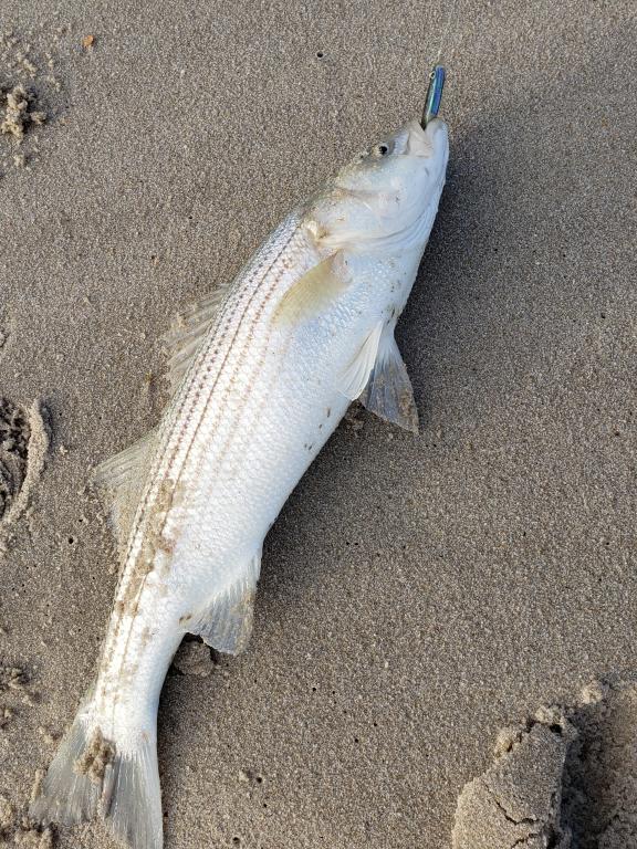 Beautiful weather and excellent conditions this morning. I tried a little north of Island Beach. Wasn't expecting much and I scaled down my presentation and fished low and slow. I worked my way to a spot that I saw some loons working in close and got a couple lethargic taps before hooking a small Bass by letting my rig hang on the beach lip. When the tide topped off the cloud cover broke up and what little action there was faded. Very happy to get out and fortunate to get some action. Here's to a happy and healthy new year and best of luck to all.