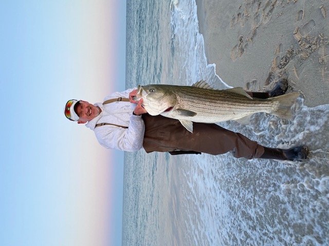 Hit the Barnegat Light surf late Friday afternoon with fresh bunker right off the bait boat. Fist fish was about a 2 lb. blue which went to swim another day. Guy next to me was fishing for the last 4 hours without even a bite and as he was leaving asks me if I wanted his salted clams which I said sure. Reeled in one rod and put a nice gob of clam on the circle hook and sent it out while the other rod had a nice piece of fresh bunker. Within 5 minutes the clam rod goes off and it’s game on with. 42lb striper. If that guy is reading this report he has to be pissed. Couple more bluefish hits then the skates took over and I called it a night.