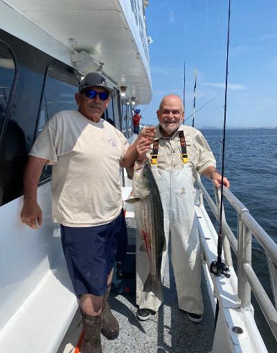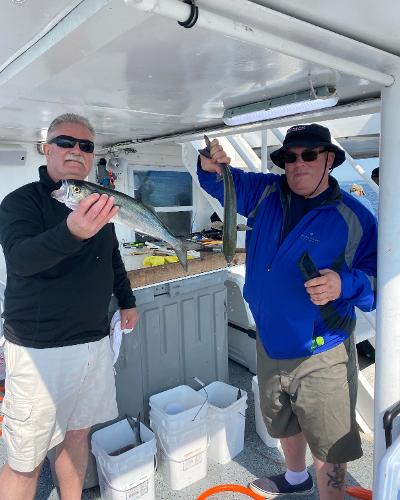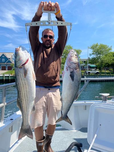 This morning, we ran offshore and had great fishing! We jigged 2-3 lb blues for awhile and then later in the day we were pulling in 15 lb blues, along with some nice stripers. We had great readings, along with the blues in schools of bunker. It was an excellent day with a majority of anglers catching their limits of blues! Our pool winner was Sam Liebman with a beautiful striper!