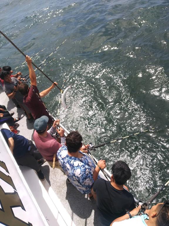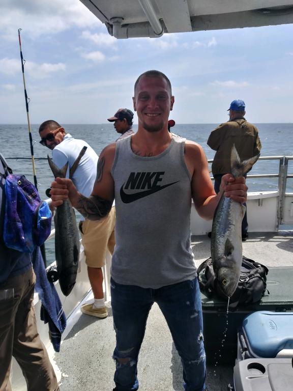 Today our day trips went very well. Great blue fishing till around mid day. We had a great start right away on stacked up readings. We've been catching 2 to 6 pound blues on AVA 27s and 47s plain and tailed. Good readings with fish on top at times. Started to slow down a bit during mid day, but overall plenty of action with limits around the boat.