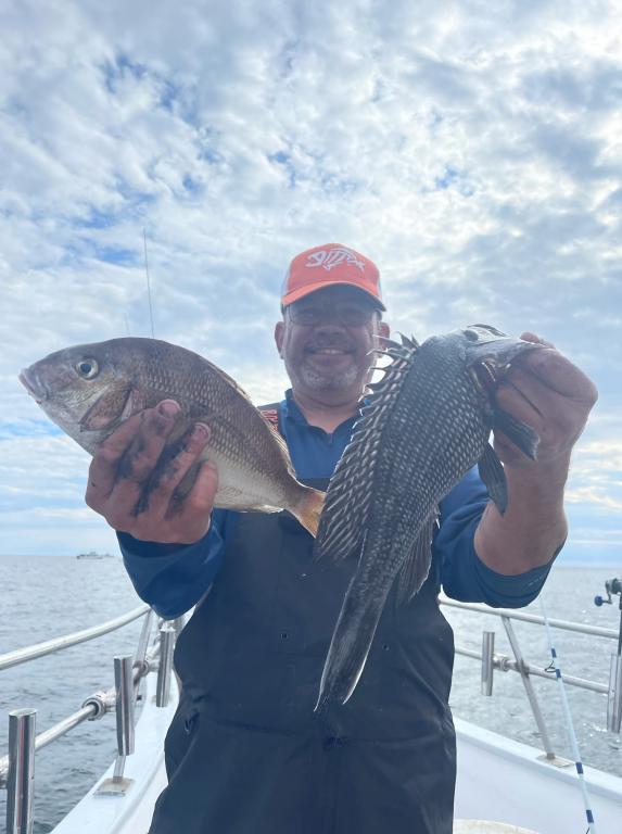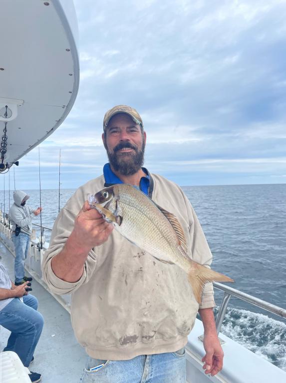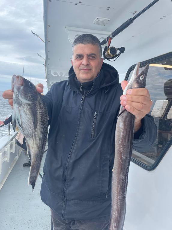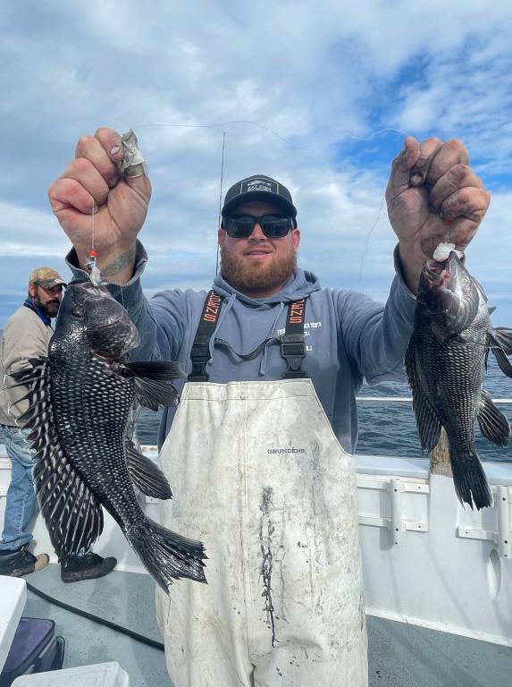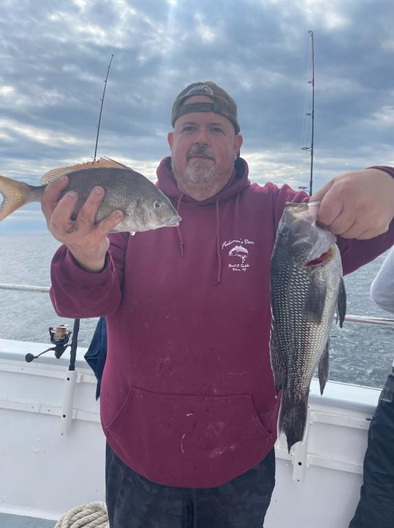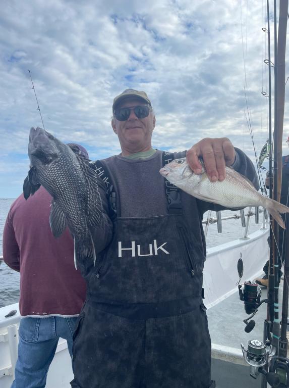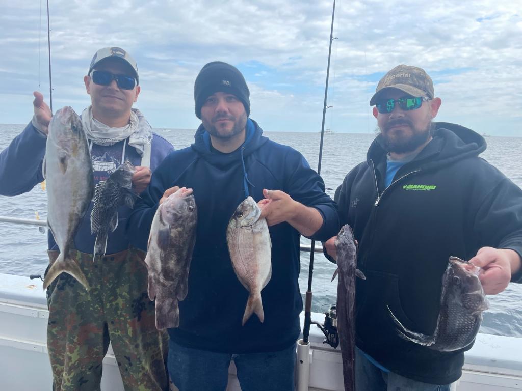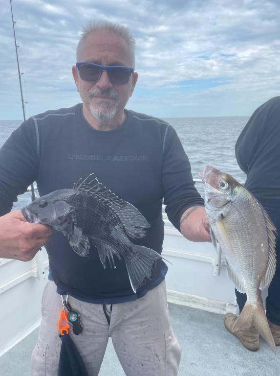 We ended up having a GOOD day. It was a pick at the beginning because of the current but at the end of the day we had a stop with double header SEA BASS with KEEPERS coming in. We also had PORGIES, BLUEFISH, LING, BLACKFISH and one ALMACO JACK. We stayed out longer so everyone could take advantage of the good action and everybody had a great time.