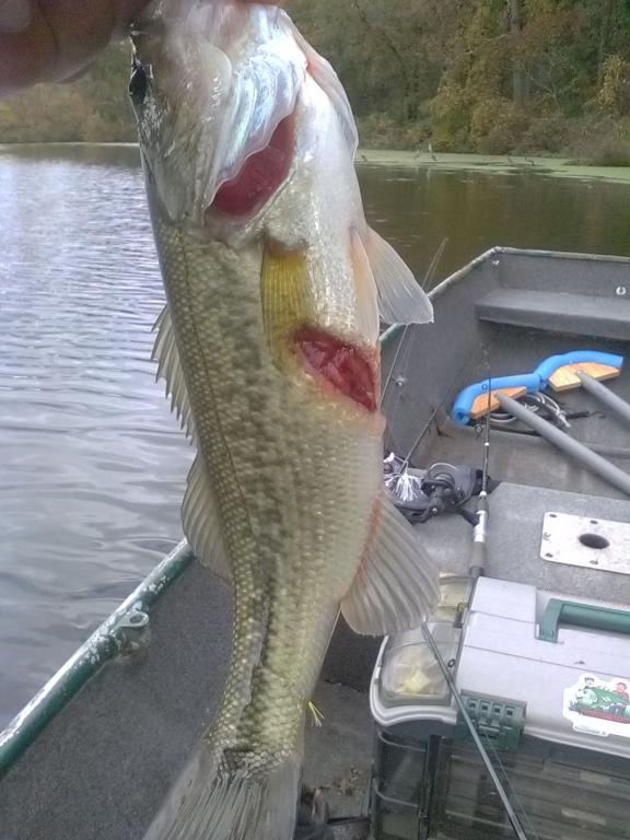 Boat electrofishing Swimming River Reservoir we captured a chunky 3 lb. LMB. His lower jaw had been split right in the middle, from the front to the back, but not recently, as the edges had healed over. Down his throat, the 2 webbed feet of a duckling were visible. Maybe the split enabled the lower jaw to open even wider.