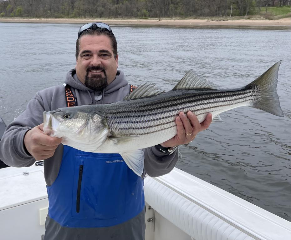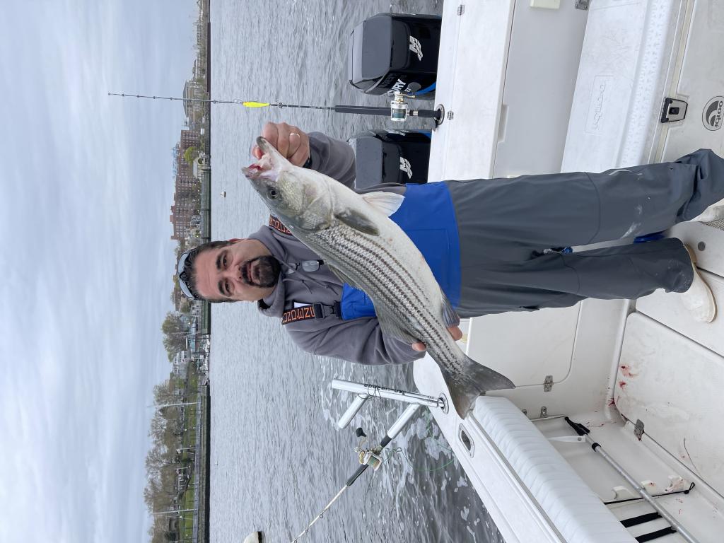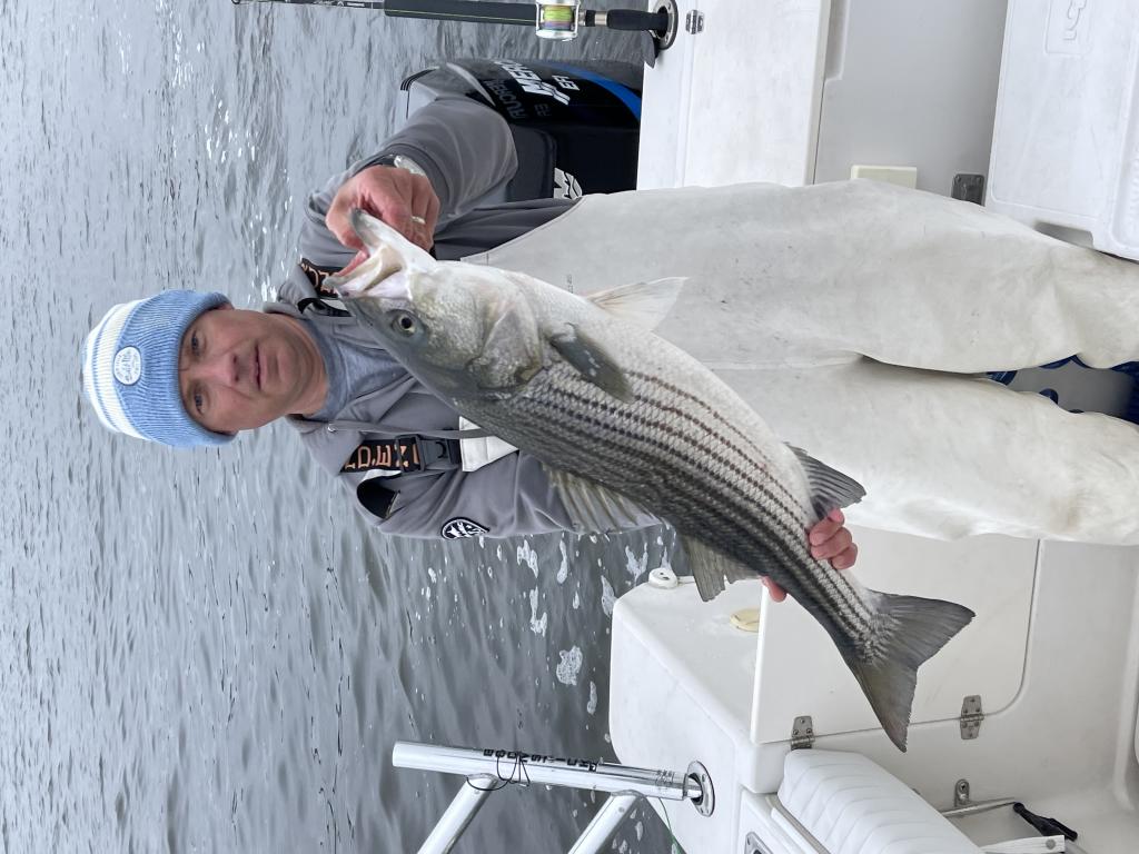 Al and I were not sure what was gonna happen with the weather, glad we stuck with our gut. Lines in at 8:05 first fish at 8:12 got another 5 min later. We were gonna make a move and decided to play it out. It was game on for a few hours. Kept our two and released over 11 nice size stripers up to 35". We were back at the dock by 11 a.m. Cleaned up and back to work. Love these trips!