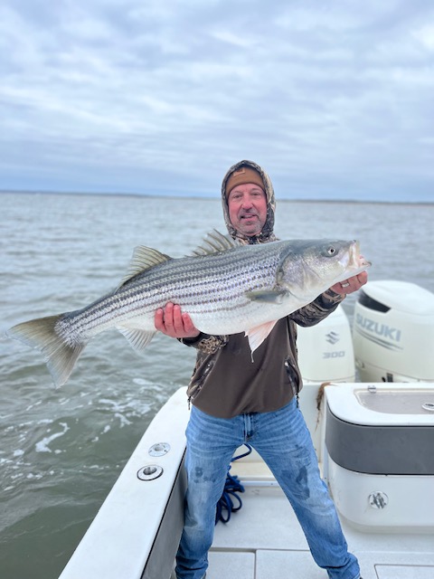 A little slower on the bass grounds today after yesterdays blow, but the guys still had very good action on both morning and afternoon trips with limits plus several dozen releases. Big fish of the day was right around 35# and everything taken on spoons and shads