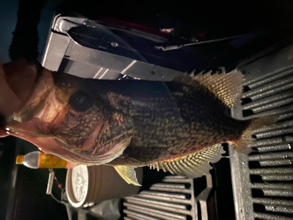 Grandson and I hit the lake again this evening to glass calm conditions. Got a couple small Crappie, a 10" Bass, and lost a Trout on the straightaway. We walked to the dam and had a slow pick on dink Crappie. Right at dark I landed a Trout broke the leader and couldn't see to retie. Grandson Chris used his phone to retie the Crappie jig for me. My next cast I only turned the handle a couple of turns when my rod loaded up and the drag went off. After a couple of minutes a nice Crappie laid on the grass. Chris caught a couple more small Crappie by rollercoaster light. We caught 13 small Crappie, 1 Bass, 1 Rainbow, and 1 nice keeper Crappie.