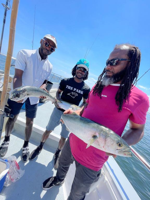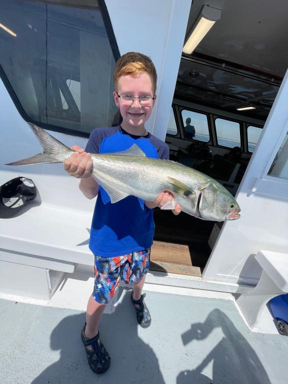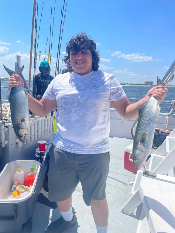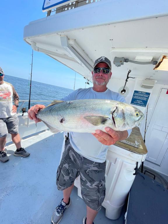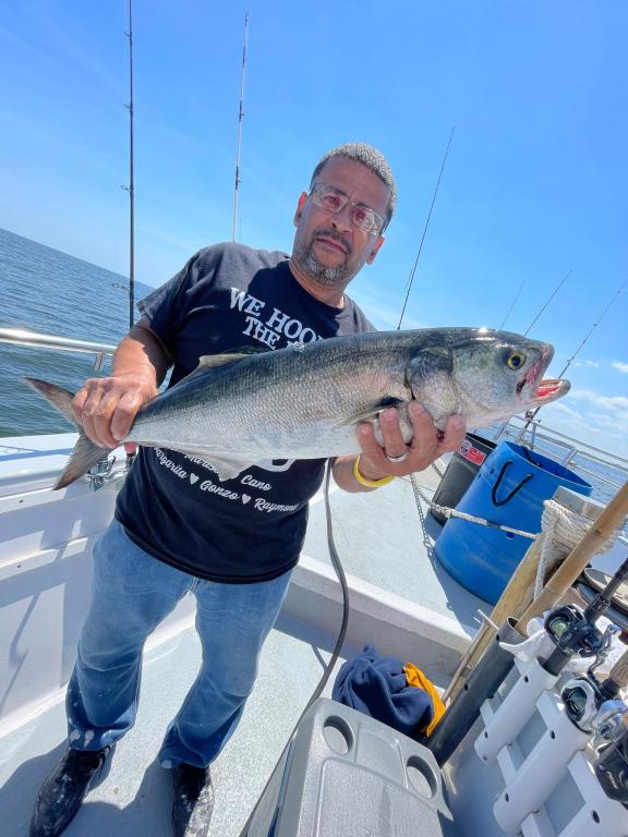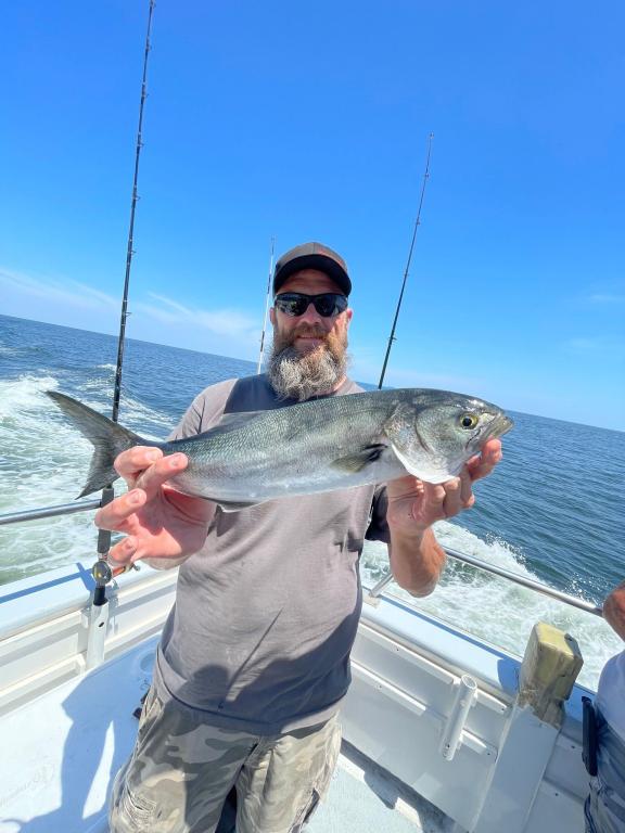 It was a tough day. We picked a couple BLUES in the morning on a few drifts. The fish came up on top for two drifts where we were able to bang away at them but then the bunkers went down and it was hard to find anything the rest of the day.